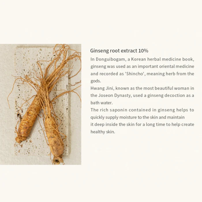 • Ginseng (10%) – Rich in saponins that deeply hydrate and help retain moisture; revered in Eastern medicine as the “herb of the gods.”