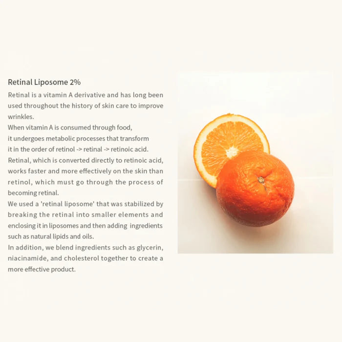 • Retinal (2%, active ingredient 0.02%) – Stabilized in liposomes for effective wrinkle reduction and improved elasticity.