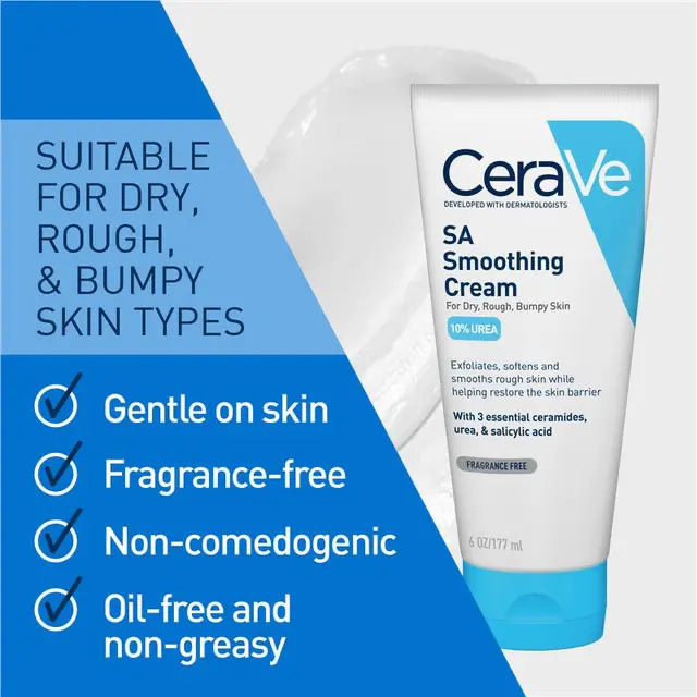 CeraVe SA Smoothing Cream Skin Type: Dry, Rough & Bumpy Skin (suitable for Keratosis Pilaris and Psoriasis-prone skin) Description: Developed with dermatologists, CeraVe SA Smoothing Cream is a rich, fragrance-free...