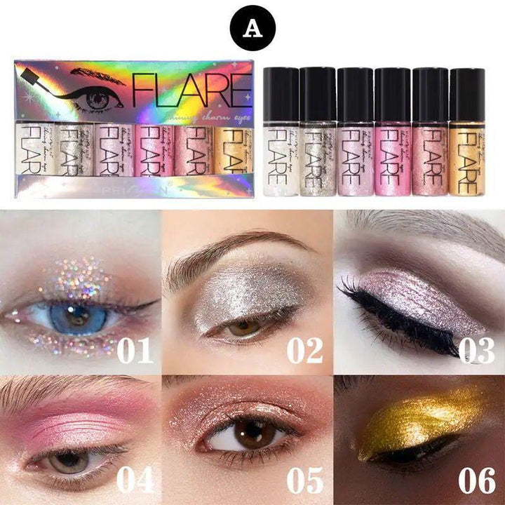 Flare Glitter Eye Liner 6pcs Set is a stunning collection of vibrant, glitter-infused eyeliners designed to add sparkle and glam to your eye makeup. Each liner features a smooth, quick-drying formula that glides effortlessly, delivering long-lasting, smudge-proof shimmer. Perfect for parties, festive occasions, and bold makeup looks, these eyeliners come in multiple dazzling shades to match every mood and outfit. Lightweight and easy to apply, they ensure precision and comfort for all-day wear.